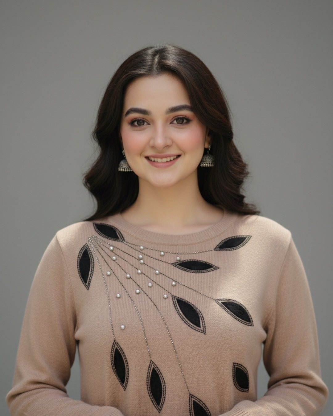 Elevate your winter wardrobe with this graceful beige knit top, adorned with contrasting black leaf appliqués and delicate pearl accents. The elegant embellishment adds a refined sparkle, making it the perfect balance between classic charm and modern sophistication.