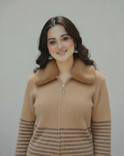 A plush faux-fur collar adds a luxurious touch, while the soft brown stripe detailing around the waist and sleeves brings refined contrast. The silver zipper with a ring pull enhances its minimal yet classy appeal — perfect for layering or wearing as a statement outer.
