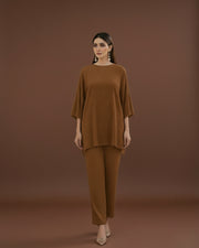Style it with nude heels or flats for a clean, polished finish. The caramel tone complements both gold and neutral accessories, making it a versatile piece for every wardrobe. Whether for a brunch, travel day, or evening get-together — this co-ord set is the perfect mix of minimalism and modern charm.