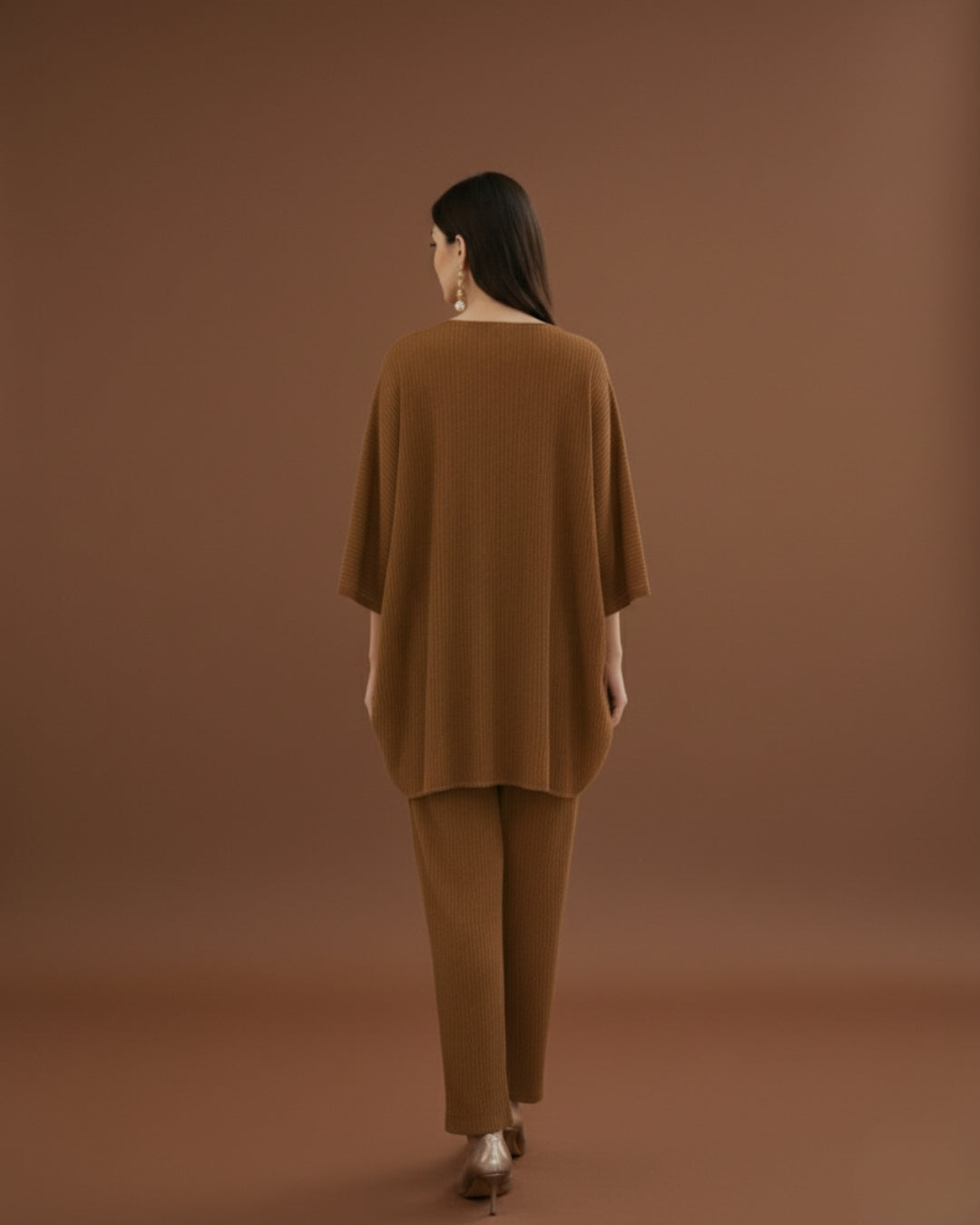 Indulge in timeless sophistication with this caramel brown oversized knitwear co-ord set. Crafted from soft ribbed knit fabric, it combines comfort and elegance with effortless grace. The warm, earthy hue adds richness to your look — perfect for cozy mornings, elegant evenings, or weekend outings.