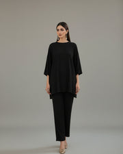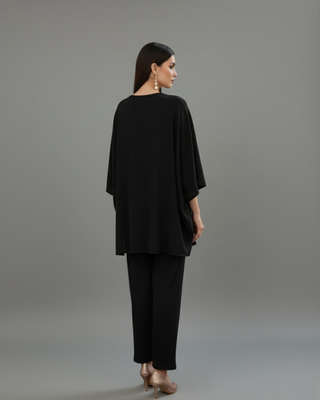 The loose-fit top drapes beautifully with wide sleeves and a high-low hem, paired with straight-cut trousers that flatter every body shape. Crafted from breathable, stretchable fabric, it offers a relaxed yet graceful feel, making it ideal for both casual days and chic evening outings.